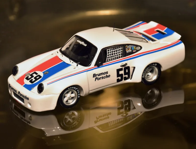 1973 Can-Am Watkins Glen, Porsche 911 Carrera RSR ‘longtail’. Development of the Porsche Carrera RSR went rapidly in 1973. The factory Martini cars had another rear body work and rear spoiler almost every race. American Brumos Racing acquired the R7 chassis and used it twice in one weekend at Watkins Glen. Peter Gregg raced it together with Hurley Haywood on Saturday during the 6-hour race wearing #59. Sunday, Gregg drove it during the Can-Am race among the big prototypes and managed to finish 9th.